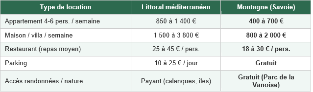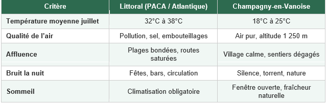 Tableau comparatif : montagne vs littoral en plein été